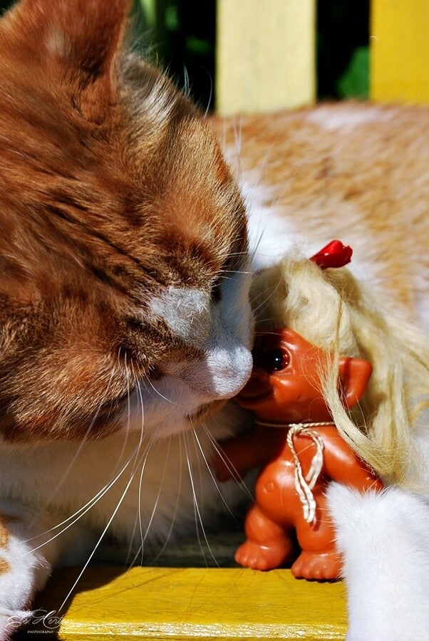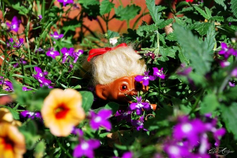 Meanwhile, Molly Trolly is enjoying the sweet perfume of the summer flowers. She thinks she's alone, so the only thing she's wearing is a red ribbon in her hair.
